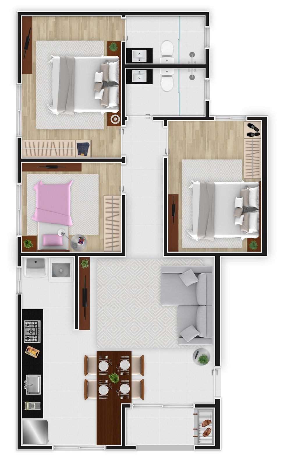 3 quartos, sendo uma suíte.